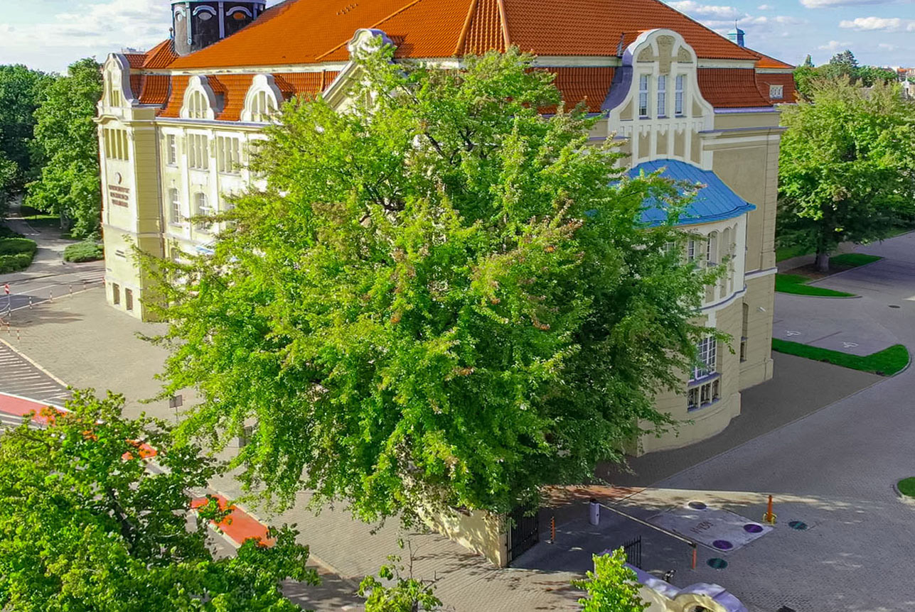 Gmach dawnej „kolejówki” na przestrzeni wieku pełnił różne funkcje. Swoją siedzibę miało tu m.in. gimnazjum realne, miejskie gimnazjum matematyczno-przyrodnicze, technikum kolejowe, a w czasach niemieckiej okupacji – nawet szpital wojskowy. Aktualnie mieszczą się tutaj Wydziały Informatyki oraz Mechatroniki Uniwersytetu Kazimierza Wielkiego. Budynek wzniesiono w latach 1903–1906, według projektu berlińskich architektów Carla Zaara i Rudolfa Vahla. Obok niego, jakby korzystając z nieuwagi gospodarzy, beztrosko wyrósł klon srebrzysty – na fotografiach z 1910 r. ledwo widoczny za ogrodzeniem, a dziś gigantyczny, o konarach przypominających ramiona siłacza dźwigającego sklepienie rozłożystej korony. Miejsce związane z Kopernikiem symbolicznie zyskało „kosmiczne drzewo”. Pomnik astronoma na pobliskim skwerze zdaje się wskazywać w jego stronę, niczym na kolejne ciało niebieskie – a raczej zielone – do odkrycia. Nad głównym wejściem widzimy zegar słoneczny, dziś nieco w cieniu drzewa. Za to pilnujące go sowy zdobiące fasadę wyglądają, jakby właśnie wyfrunęły z gęstej korony. Przekrój klonu wydaje się przysadzisty – krótki, ale potężny pień o obwodzie niemal 5 metrów stanowi solidną podstawę dla monstrualnych konarów. Tak jak gmach w stylu wilhelmińskiego neobaroku ma w sobie pewną teatralność, tak i drzewo zdaje się prężyć swoje zielone muskuły – jak aktor na scenie.
