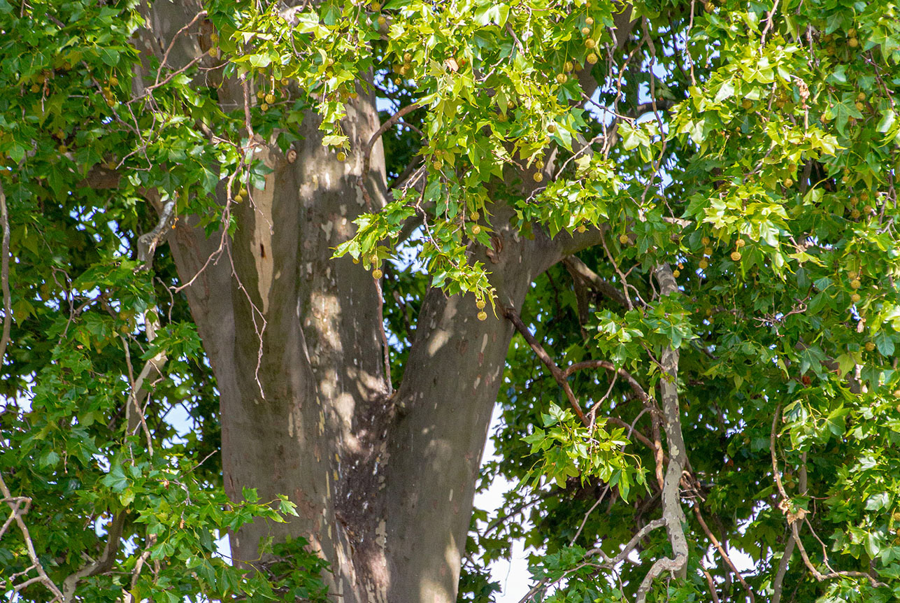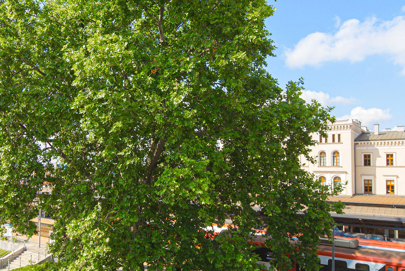 Trudno go nie zauważyć. Rośnie między starym a nowym gmachem dworca – jakby spinał przeszłość i teraźniejszość. Jego biała, łuszcząca się kora i potężna, rozłożysta korona sprawiają, że rozpoznacie go z daleka. Jesienią żółto-pomarańczowe liście rozświetlają okolicę. Platan towarzyszy podróżnym od pokoleń – wita i żegna ich od dziesiątek lat. To pomnik przyrody. Pierwszy dworzec powstał tu w 1851 r., a w 1861 założono reprezentacyjny skwer z pergolą i murkami. Czy wtedy został posadzony? Chyba nieco później – może podczas kolejnej przebudowy w 1870 r., kiedy to przed istniejącym dworcem i zieleńcem wybudowano klasyczny dworzec kolejowy, ten który obecnie jest dworcem wyspowym (zrewitalizowanym w 2015 r.). I znów przed nowym dworcem założono zieleniec dworcowy. Gdy spoglądamy na układ dworca, nietrudno sobie wyobrazić (pomijając współczesny gmach zwany „największym zszywaczem świata”), że platan posadzono celowo właśnie w jego pobliżu. W 1915 r., po pożarze dworca, wybudowano nowy masywny, prostopadłościenny gmach kryty dachem namiotowym. W kubicznej wieży pośrodku dachu zlokalizowano duży zegar. Na placu przed dworcem nadal zachowano ozdobny zieleniec, który stanowić miał wizytówkę miasta dla przyjezdnych. Został on przebudowany w 1926 r., zyskując jeszcze bardziej reprezentacyjną formę. Kolejną gruntowną przebudowę dworca wykonano na przełomie lat 60. i 70. XX wieku, nadając mu zupełnie inną formę. Pamięta ją już większość bydgoszczan. Wówczas zlikwidowano również zieleniec przed dworcem, urządzając w jego miejscu parking dla samochodów i autobusów. Na archiwalnych zdjęciach widzimy, jak platan pnie się coraz wyżej i wyżej. Rozpoznajemy to drzewo już na fotografiach i rycinach z początku wieku. W latach 50. XX w. wystaje ponad dach z wieżą zegarową – zawsze potrafił się wpasować: dyskretnie, nie zawadzając, taktownie. Trwa uparcie, przyglądając się zmianom otoczenia i kolei. Widział, jak ostatni parowóz opuścił dworzec i pierwszy Pendolino wjechał na stację. Spoglądając na podróżujących przez dziesięciolecia, sam podróżuje w czasie.